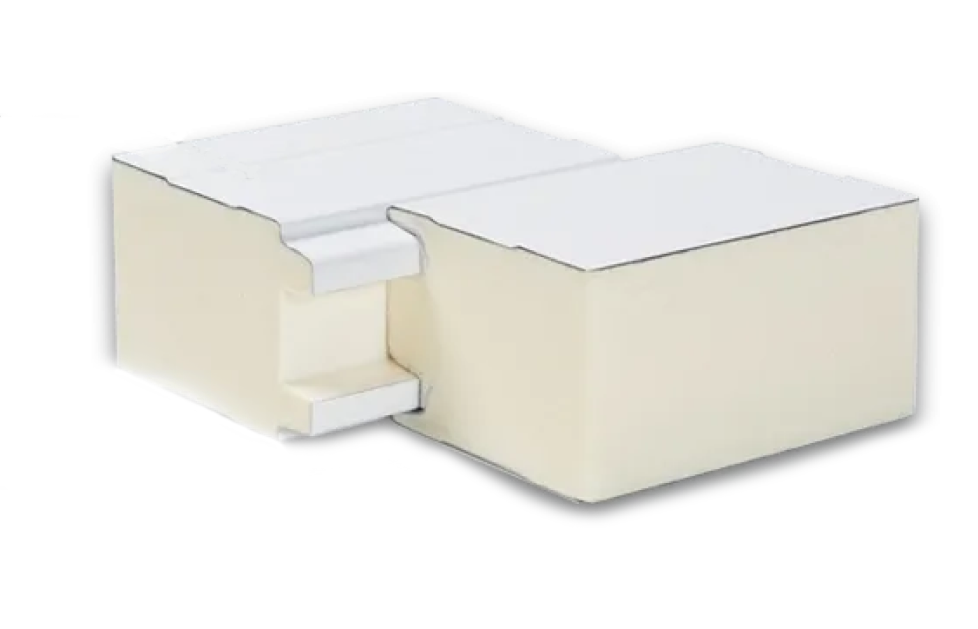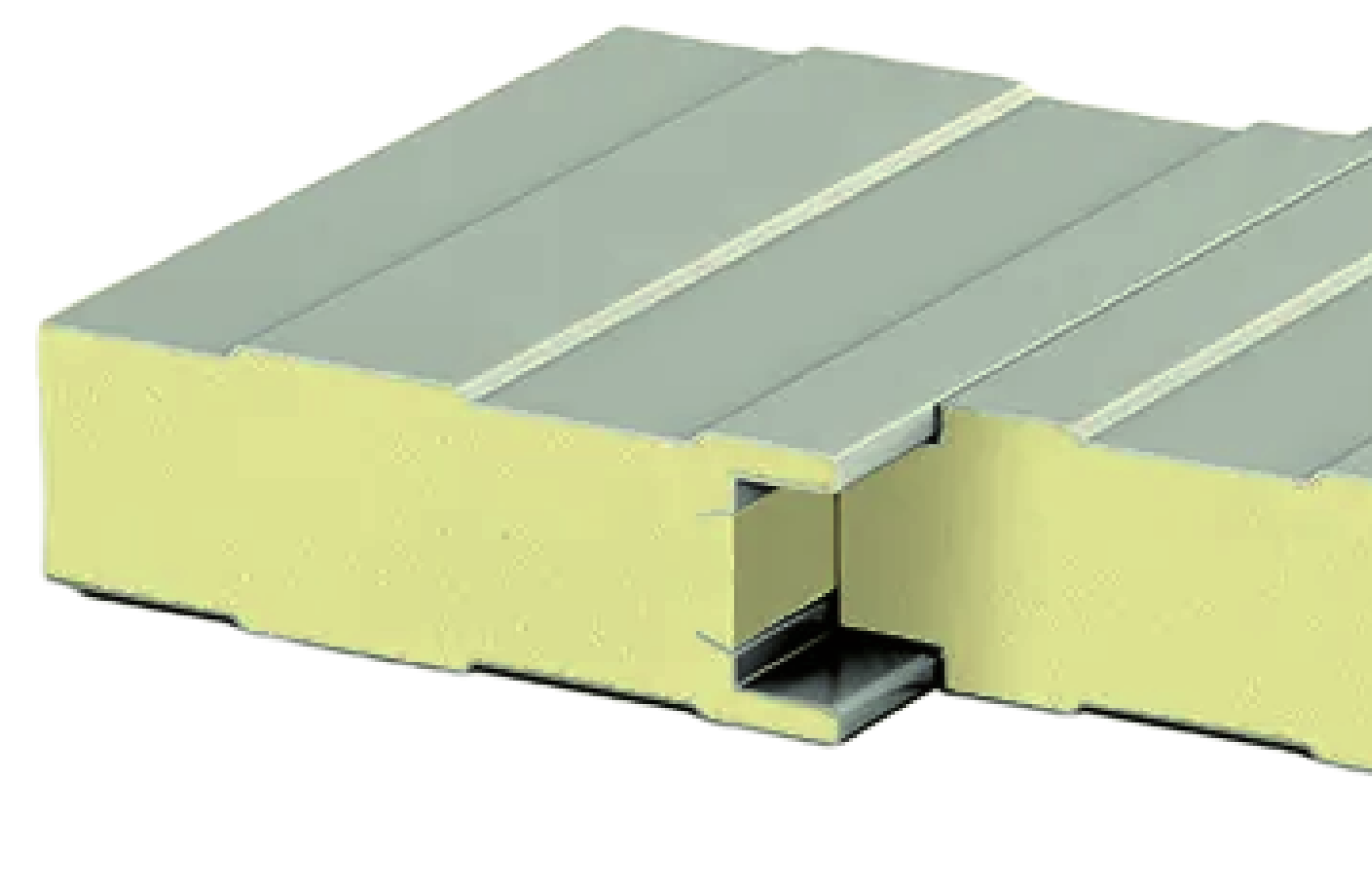 - Максимальная жесткость сэндвич-панелей обеспечивается за счет специальной конструкции, когда края металлических листов уходят в пену, и микропрофиля глубиной 1,5 мм. При стыковке панелей по металлическому листу образуется треугольный паз, который фиксирует герметик. Коническая форма металлической обкладки замка направляет сэндвич-панели при стыковке.
